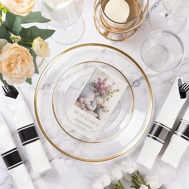 ✨Durchsichtiger Kunststoff-Essteller mit GoldrandEleganter Einwegteller mit hochwertigen Metallakzenten