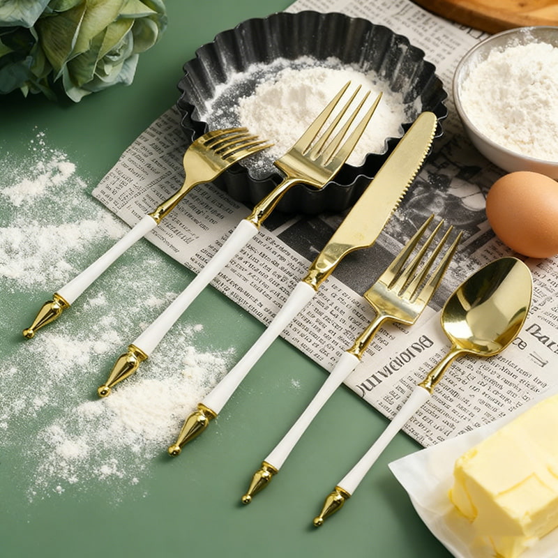 Gold head + white handleElegant Aesthetic:Features a chic two-tone design with lustrous gold-finished heads and clean white handles, adding a touch of luxury to any table setting.