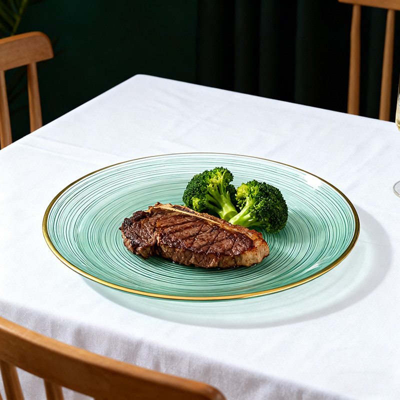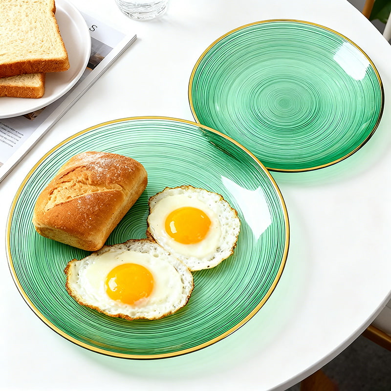 17.8 cm, 25.4 cmEye-Catching Aesthetic:Features a textured swirl base and sleek gold rim for a modern, elegant look. The mint-green option in the image creates a fresh, Instagram-worthy table setting that elevates any meal presentation.