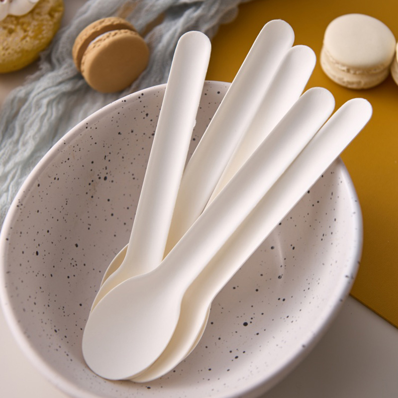 The set prominently features a sturdy paper spoon, specifically engineered for durability to handle soups, yogurts, and desserts effectively. Each piece is responsibly manufactured to minimize environmental impact.