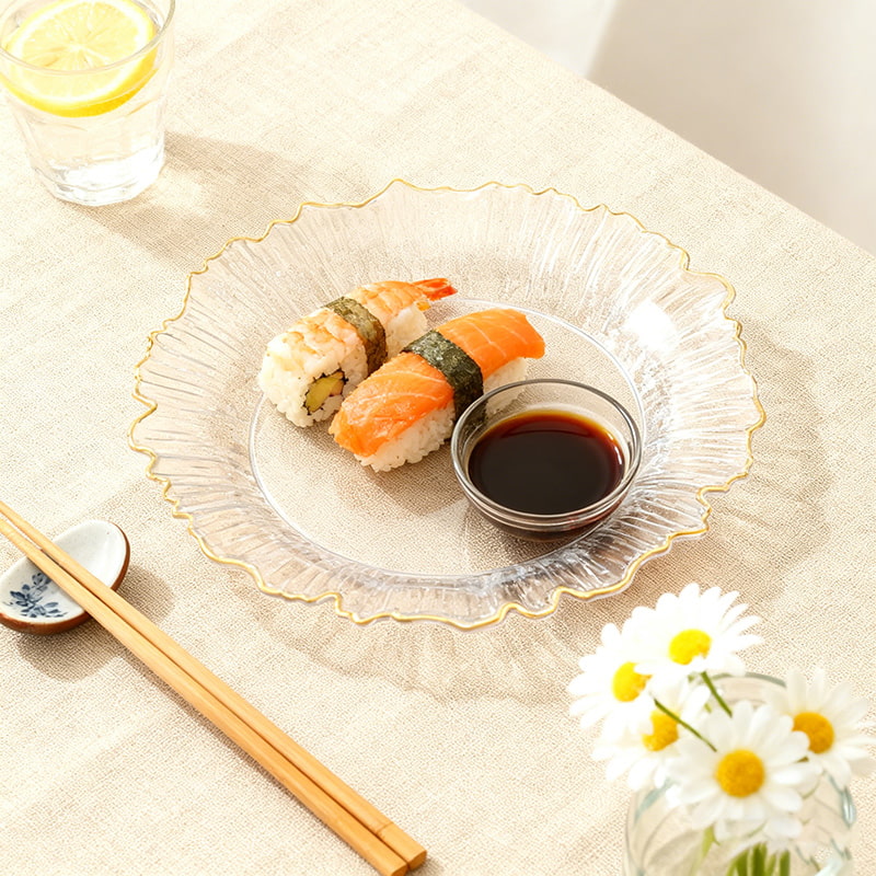 Künstlerisches und elegantes DesignEinzigartige, unregelmäßige Freiform-Silhouette für einen modernen, künstlerischen Look; kristallklarer Korpus bringt die Farben und Texturen der Speisen optimal zur Geltung, gepaart mit einem zarten Goldrand, der der Tischdekoration ein raffiniertes, luxuriöses Finish verleiht.