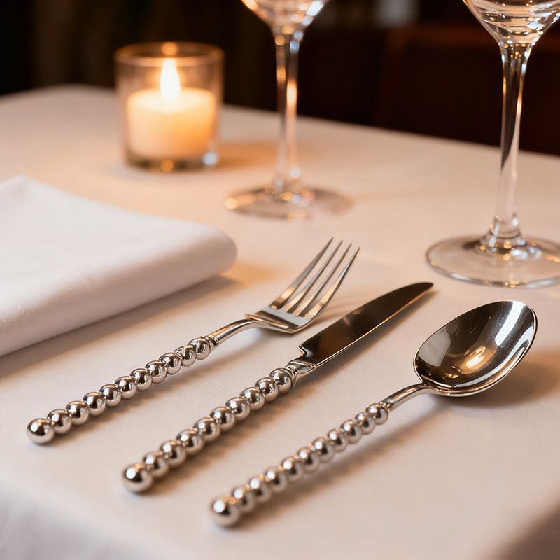 Elegantes, herausragendes Design: Verfügt über einen glänzenden silbernen Perlmuttgriff mit irisierendem Finish, der den Glanz von Perlmutt und Silber imitiert und so Tischdekorationen für den privaten oder gewerblichen Gebrauch Eleganz und Glamour verleiht.