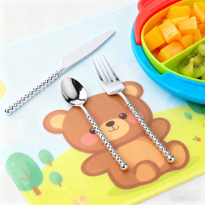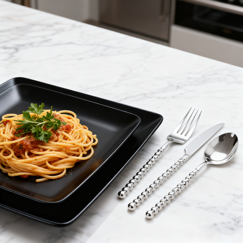 Praktisches, funktionales Design: Das Messer ermöglicht müheloses Schneiden von herzhaften Speisen, die Gabelzinken spießen Salate/Fleisch sicher auf, und der Löffel ist so geformt, dass er Suppen/Soßen/Desserts leicht aufnehmen kann – so werden alle Anforderungen an ein perfektes Essgeschirr erfüllt.