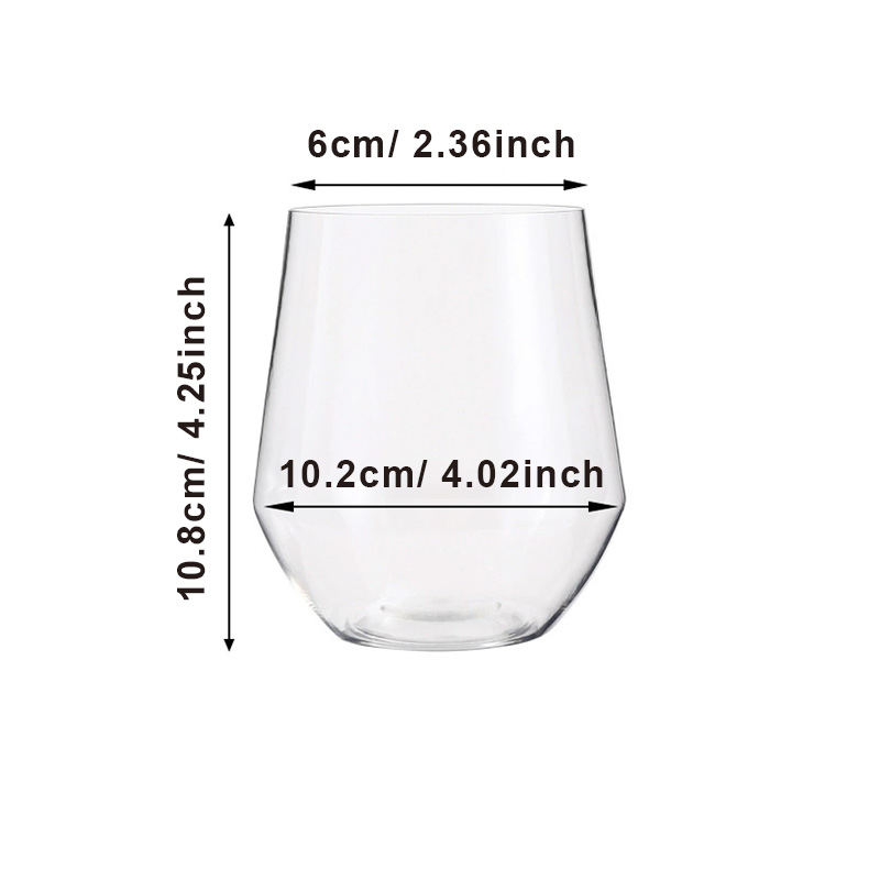 H10.8cm*W10.2cm*6cmDesigned for both style and functionality, these 15oz stemless plastic drinking glasses blend the elegance of traditional glassware with the durability of food-grade plastic—perfect for everyday use and special occasions.