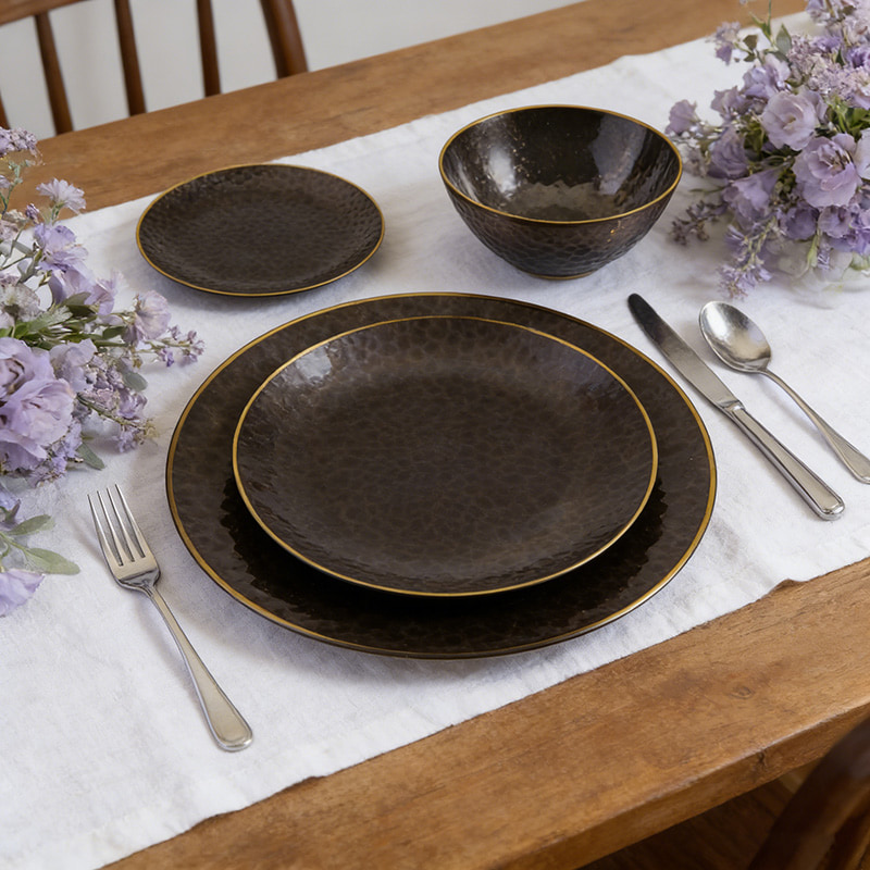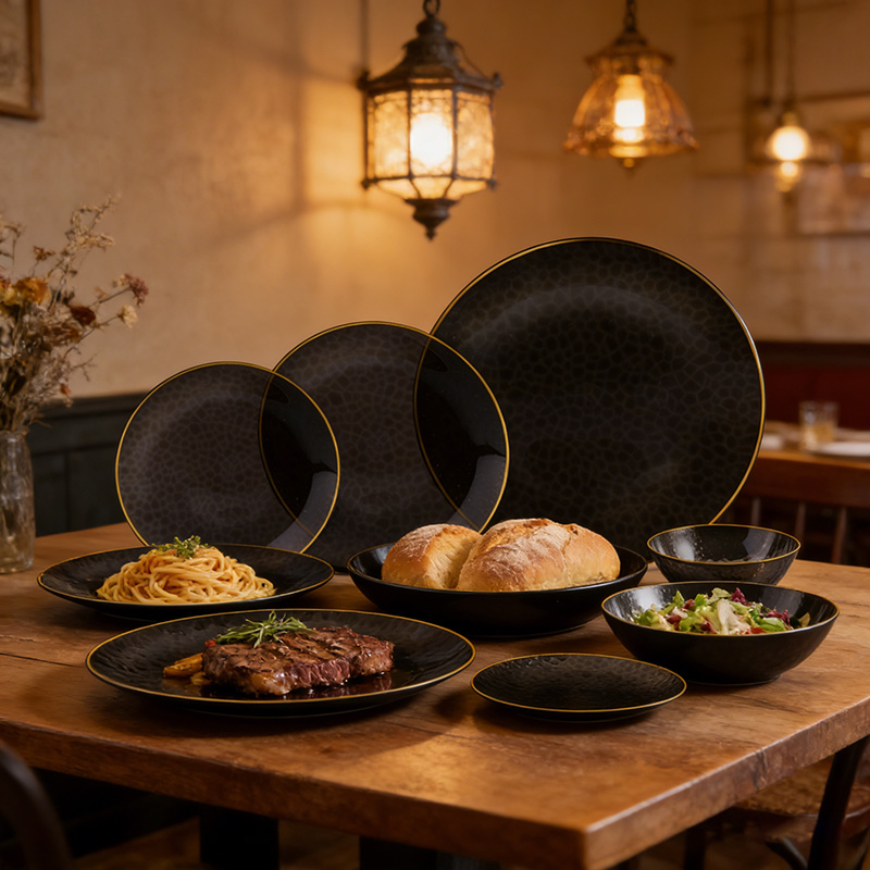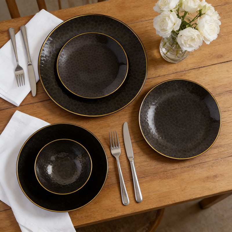 clear black plate with gold rimPremium-ÄsthetikDie gehämmert wirkende Textur und der Goldrand imitieren luxuriöses Metallgeschirr und eignen sich ideal für gehobene Veranstaltungen.