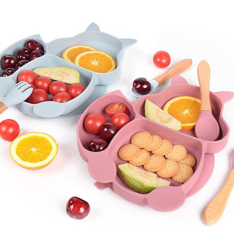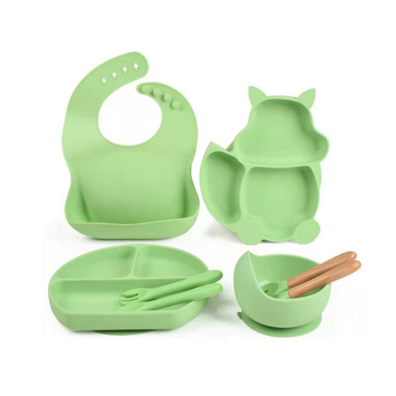 CustomizedKomplettes Fuchs-Set: Enthält einen Saugnapfteller, eine Saugnapfschüssel, ein Silikonlätzchen, einen Löffel aus Naturholz sowie einen zusätzlichen Löffel und eine zusätzliche Gabel.
